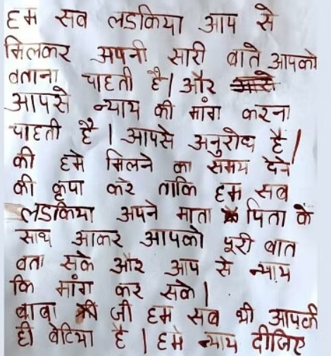 Ghaziabad प्रधानाचार्य के खिलाफ छेड़छाड़ की रिपोर्ट दर्ज कराने वाली वेव सिटी थाना क्षेत्र के एक स्कूल की छात्राओं ने सोमवार को सीएम योगी के नाम अपने खून से खत लिखा। इसमें सीएम से आरोपी प्रधानाचार्य पर कार्रवाई की मांग की गई है। छात्राओं ने लिखा है, बाबा जी… हम सब आपकी बिटिया हैं, हमें न्याय दीजिए।