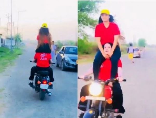 जिसमें एक लड़की बुलेट बाइक चला रही है, जबकि दूसरी युवती बाइक चला रही युवती के कंधों पर बैठी हुई है। बीच सड़क पर यह स्टंट की वीडियो बनाई गई है।