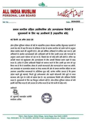 देश के मुसलमान स्वीकार नहीं करेंगे समान नागरिक संहिता-All India Muslim Personal Law Board