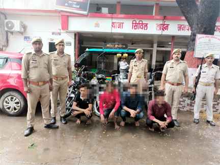 मुजफ्फरनगर।(Muzaffarnagar News)थाना सिविल लाईन पुलिस द्वारा ०४ नफर अन्तर्राज्यीय वाहन चोर/मोबाईल लुटेरे गिरफ्तार, कब्जे से ०४ अदद चोरी की मोटर साईकिल, एक ई-रिक्शा, ०२ अदद मोबाईल व २२०००/- रूपये नगद बरामद किये। अभियुक्तगण रेकी करने के बाद करते थे मोटरसाइकिल चोरी, चोरी की गयी मोटरसाइकिल से देते थे मोबाइल लूट की घटनाओं को अंजाम।