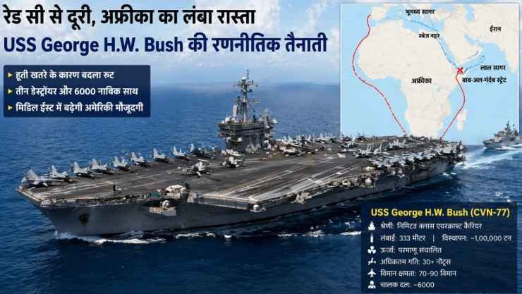 दुनिया के सबसे शक्तिशाली युद्धपोतों में गिने जाने वाले USS George H. W. Bush ने अपनी तैनाती के दौरान पारंपरिक समुद्री मार्ग छोड़कर लंबा रास्ता अपनाया है। यह बदलाव सामान्य नौसैनिक मूवमेंट नहीं माना जा रहा, बल्कि इसे मध्य पूर्व में बढ़ते तनाव और यमन के हूती विद्रोहियों की गतिविधियों से जुड़ी रणनीतिक सावधानी के रूप में देखा जा रहा है।